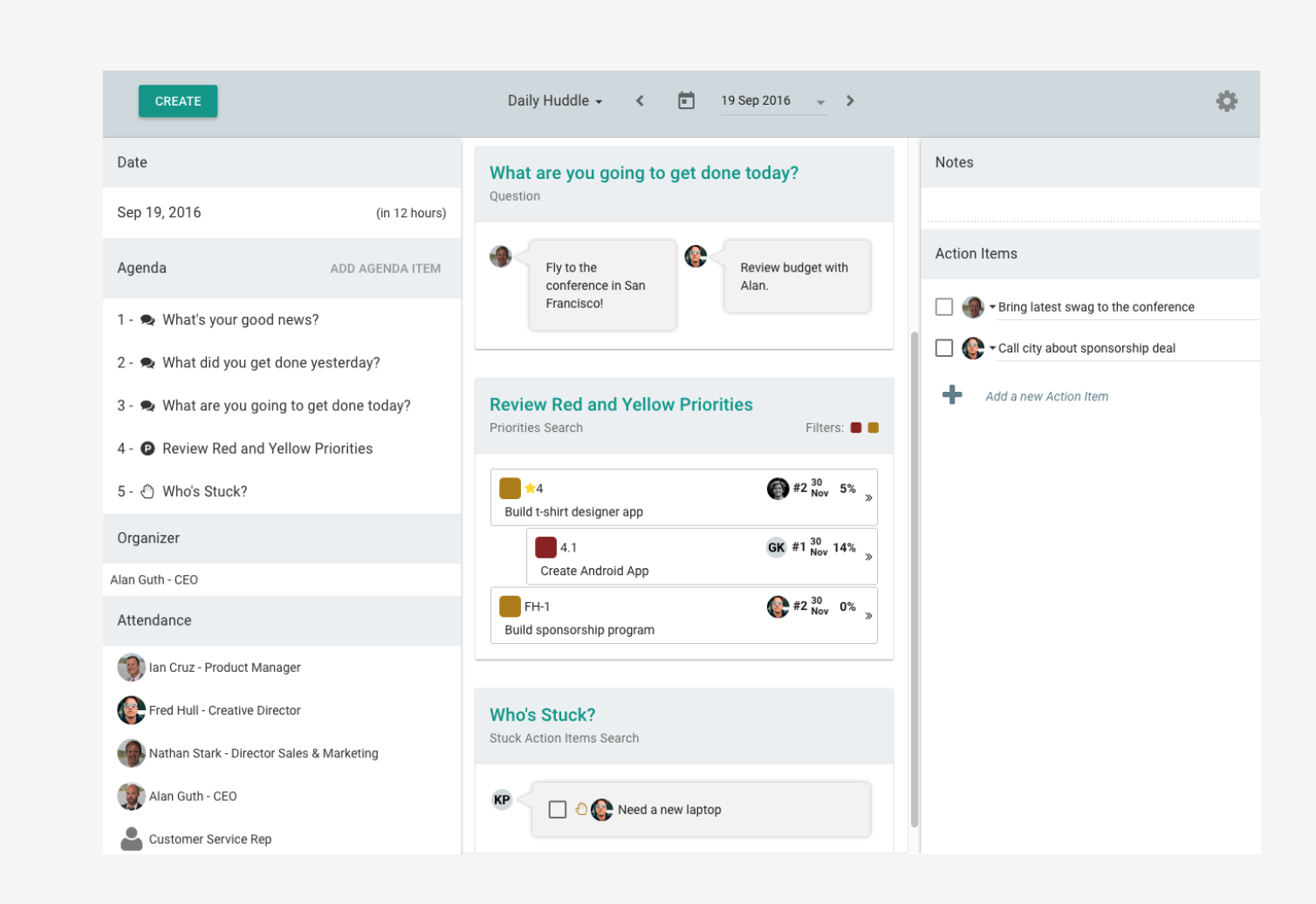 Access to concise and timely information makes you a more efficient coach and helps you manage more clients. Time is your most valuable asset as a coach and with MGS, you can have more of it available for what matters most to you, whether that is managing another client, reading and learning or personal time! Your clients will also save time too by having all company information on a single cloud based tool, utilizing features like meeting templates, One Page Plans, and more. (below is an example of a daily huddle meeting template)