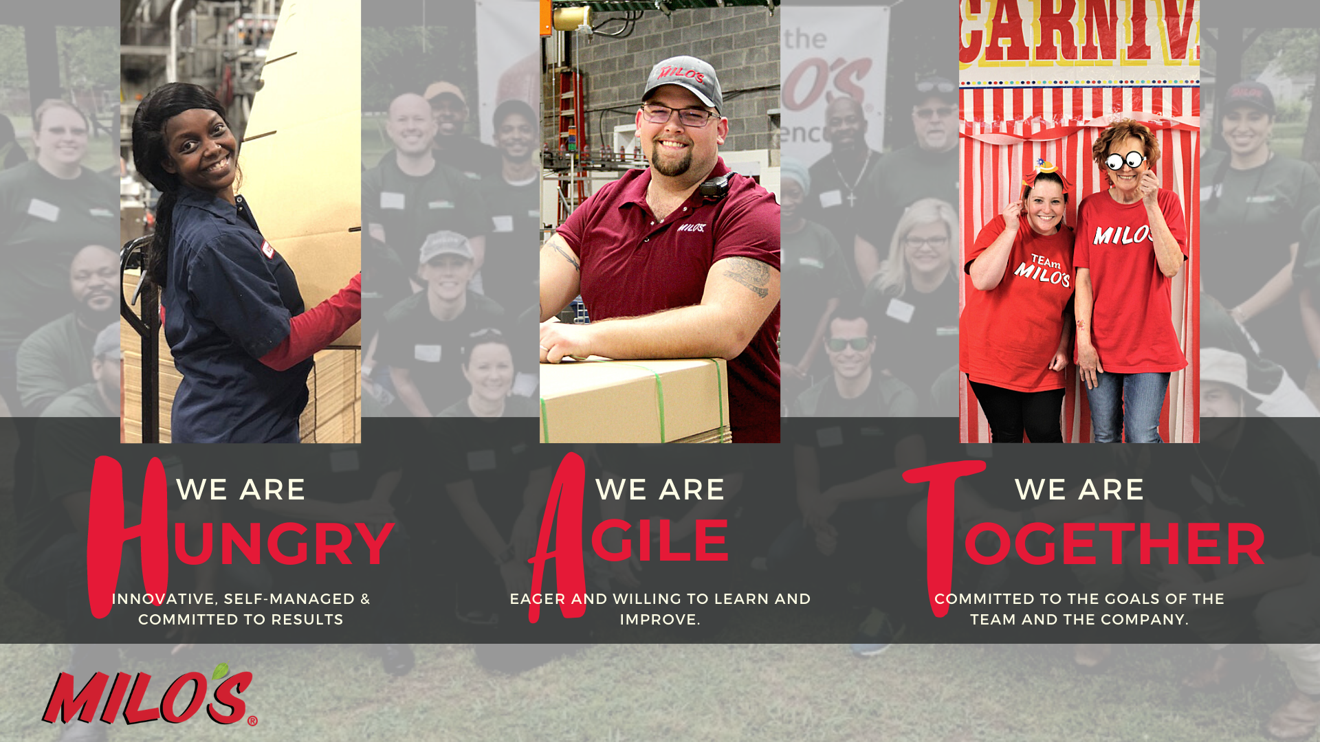 Along with topping up their 3HAG, Shannon encouraged Milo’s to develop people-centred values before they entered year two. To compliment the values that already existed, Shannon asked Milo’s leadership team to brew on the question ‘what type of person will succeed at Milo's?’ “These new values gave us a clear picture of who would thrive at Milo's. What we call this now internally at Milo's is the Milo's ‘H.A.T.’ - Hungry, Agile, and Together.